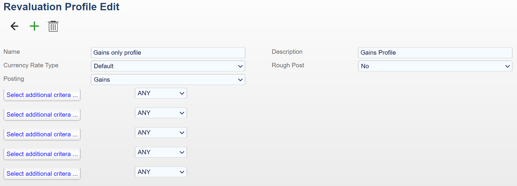 Create one or more Revaluation Profiles at Configuration > Revaluation Profiles using the view shown below.