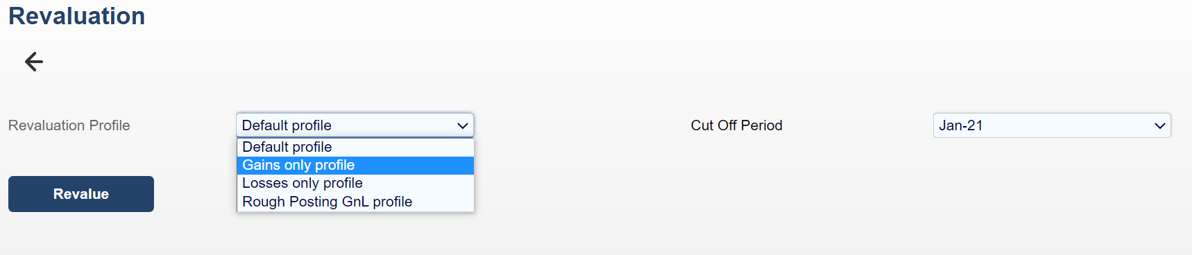 To revalue your ledger select a Revaluation Profile and Cut Off Period and click Revalue.
